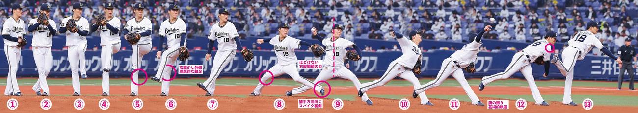 一方、山本の⑨では右の股関節がほどけていない。佐々木朗に限らず、すべての投手が手本にしていい形ができている。