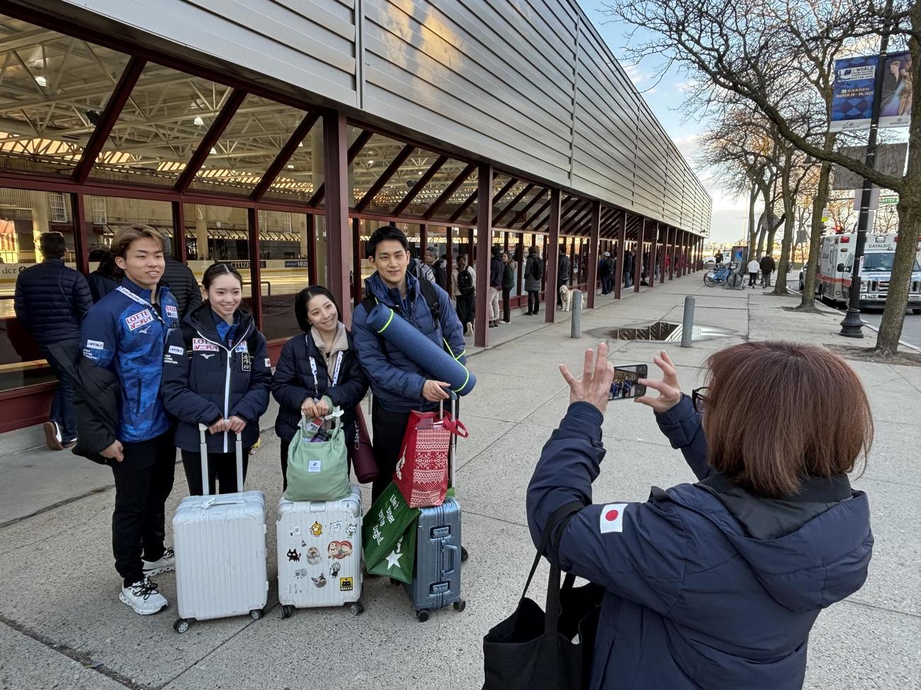 日本スケート連盟関係者にそう声をかけられ、一緒にシャトルバスを待つ後輩の長岡柚奈、森口澄士組と4人で横に並んだ。リンクをバックに記念撮影。肩の力が自然と抜けているように見えた。