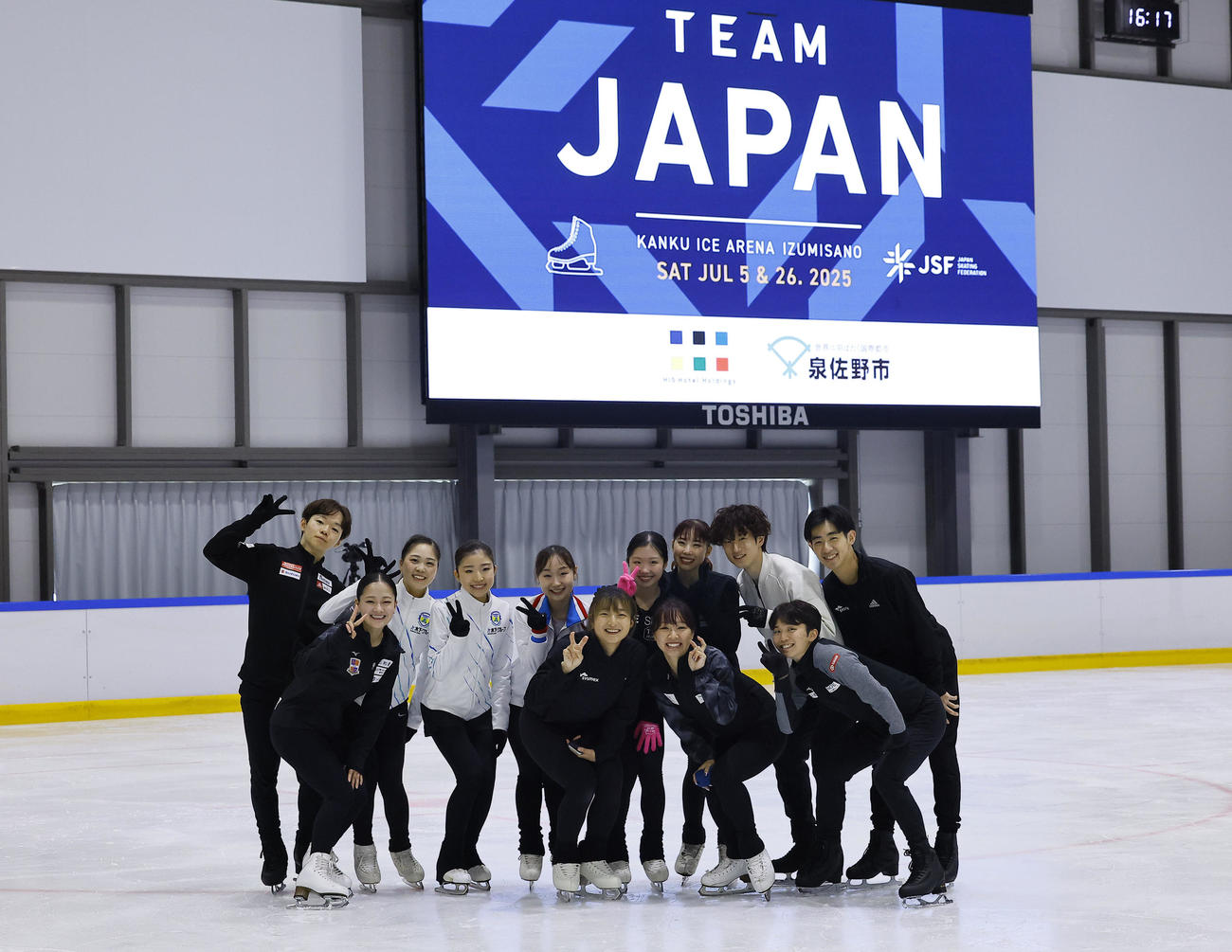 フィギュアの五輪対策合宿公開練習を終え、集合写真に納まる左から鍵山優真、渡辺倫果、吉田陽菜、千葉百音、松生理乃、坂本花織、中井亜美、樋口新葉、住吉りをん、山本草太、友野一希、壷井達也(撮影・藤尾明華)