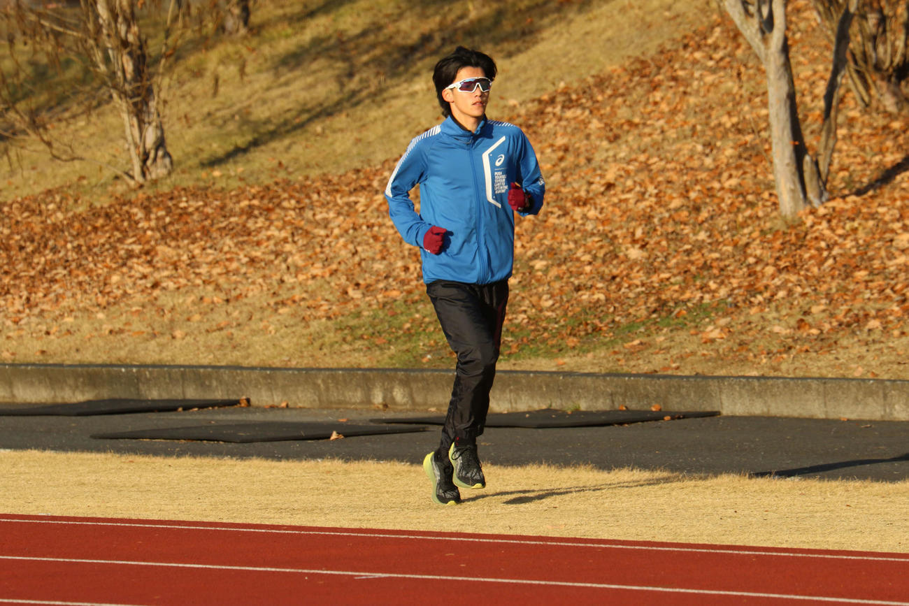 濱本は、夕刻の練習のために一足早く織田幹雄記念陸上競技上でアップのジョグを進めていた。師走に似合わない陽光の名残の夕日はまぶしく、サングラス姿で表情の全ては分からない。ただ、幾度もシャッターを切った。
