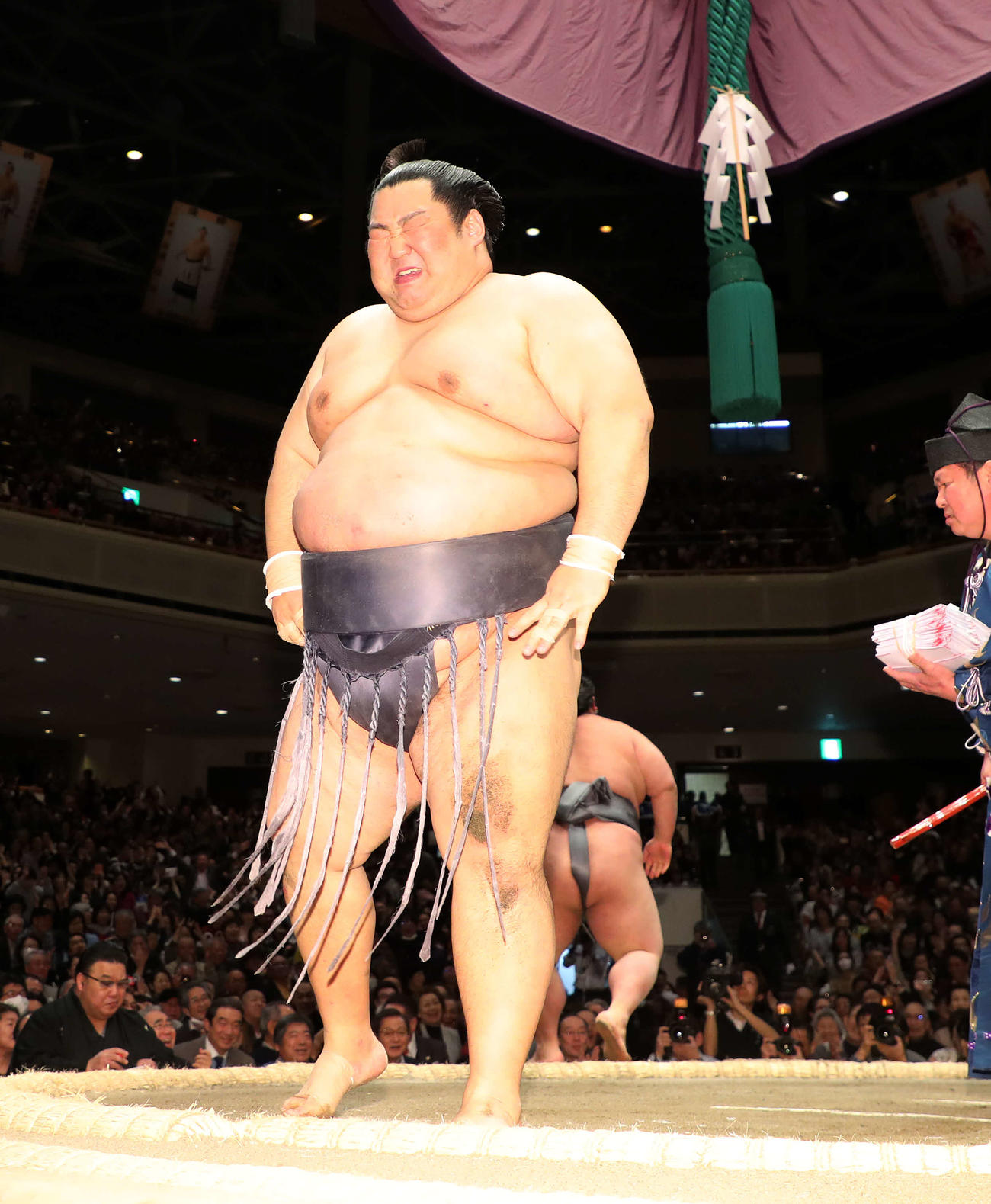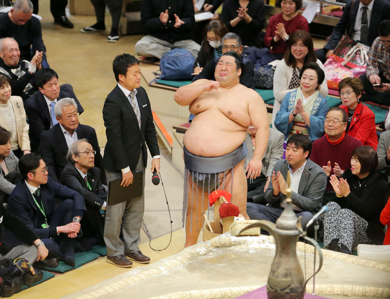 (マイクを下げた小林アナも涙ぐむ)(徳勝龍は涙、右手で目をぬぐう)(場内拍手)