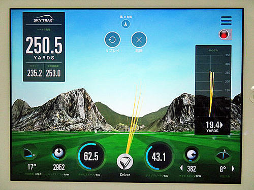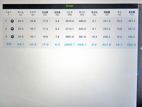 HS43.5m/s、初速63.1m/s、打ち出し角17.0度、バックスピン量2900.1rpm、サイドスピン-456.1rpm、飛距離252.9y