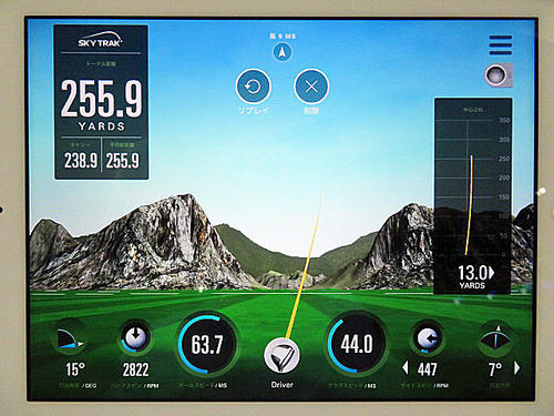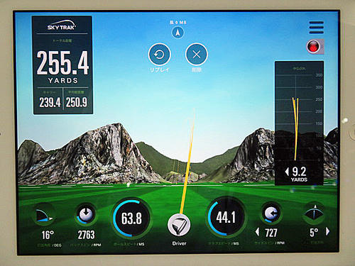 HS44.1m/s、初速63.8m/s、打ち出し角16.1度、バックスピン量2763.8rpm、サイドスピン-726.6rpm、飛距離255.3y