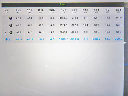 HS43.9m/s、初速63.5m/s、打ち出し角16.1度、バックスピン量3166.0rpm、サイドスピン-501.6rpm、飛距離250.9y