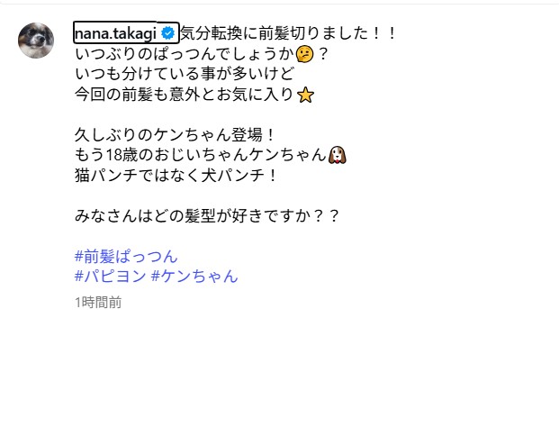 【スケート】新ヘア高木菜那さん「いつぶりのぱっつんでしょうか?」愛犬抱いて前髪切った最新画像公開